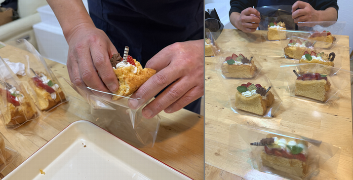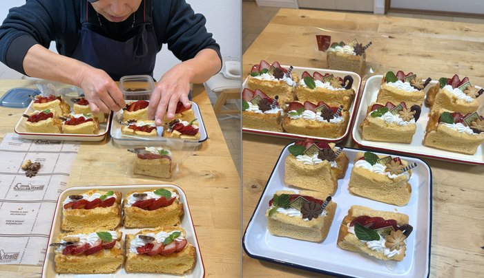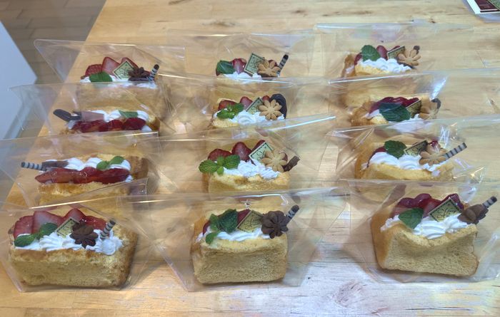事前に準備したシフォンサンドのデコレーションイメージサンプルをご覧いただいたうえで、シフォンサンドの構成や配置の確認をしました。