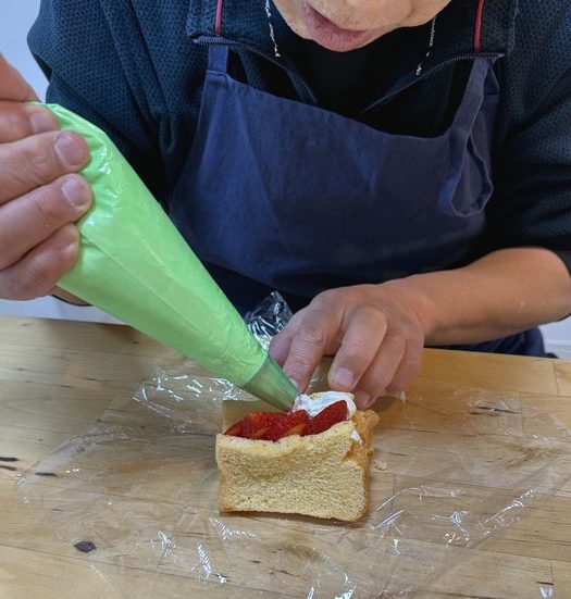 そして、いちごは少し粒が大きいので4枚にスライスし、前回のレッスンで方向性を決めたクリーム(ブレンド)を絞りやすい硬さになるまで泡立てました。