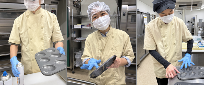 次に、型に使うスプレーオイルや焼成温度の違いなどを比較し、どの条件がより良い仕上がりにつながるのかを実験しました。
