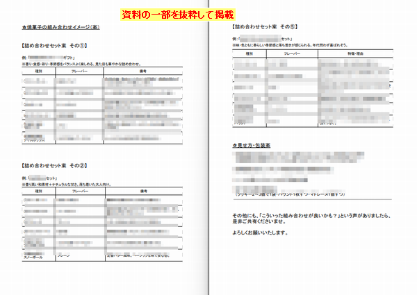 また、技術指導の実施に先立ち、【ギフト組み合わせイメージ5パターン(案)】の資料を作成し、スタッフの皆様と事前に共有しています。