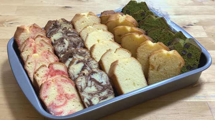 持参したパウンドケーキは5種類。(今回の技術指導で実際に作成するのは2種類です)