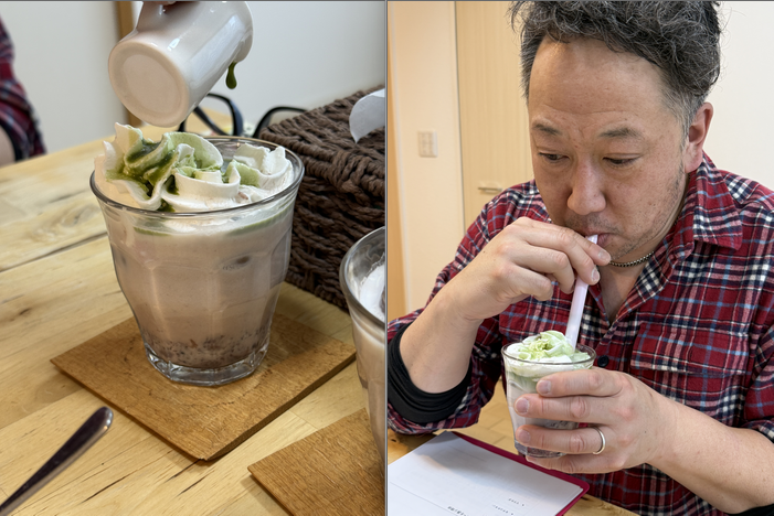 こちらは次の休憩タイムにお出しした抹茶小豆ミルクです。小豆ミルクの仕上げに、ご自身で抹茶を注いで完成させました。