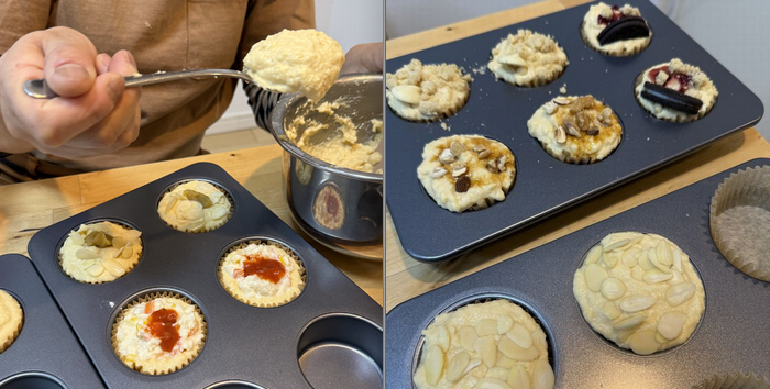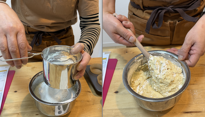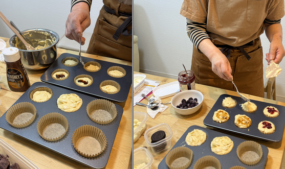 大サイズのマフィンと、中サイズのマフィンを作り、理想の大きさを考えます。