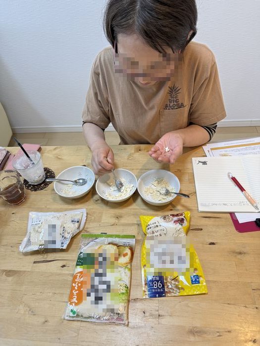 おからといっても様々な種類があります。そこで手に入れやすいおからの中から、生おから、乾燥おからなど、水分を入れたときの状態確認から食感の違いの比較など行いました。